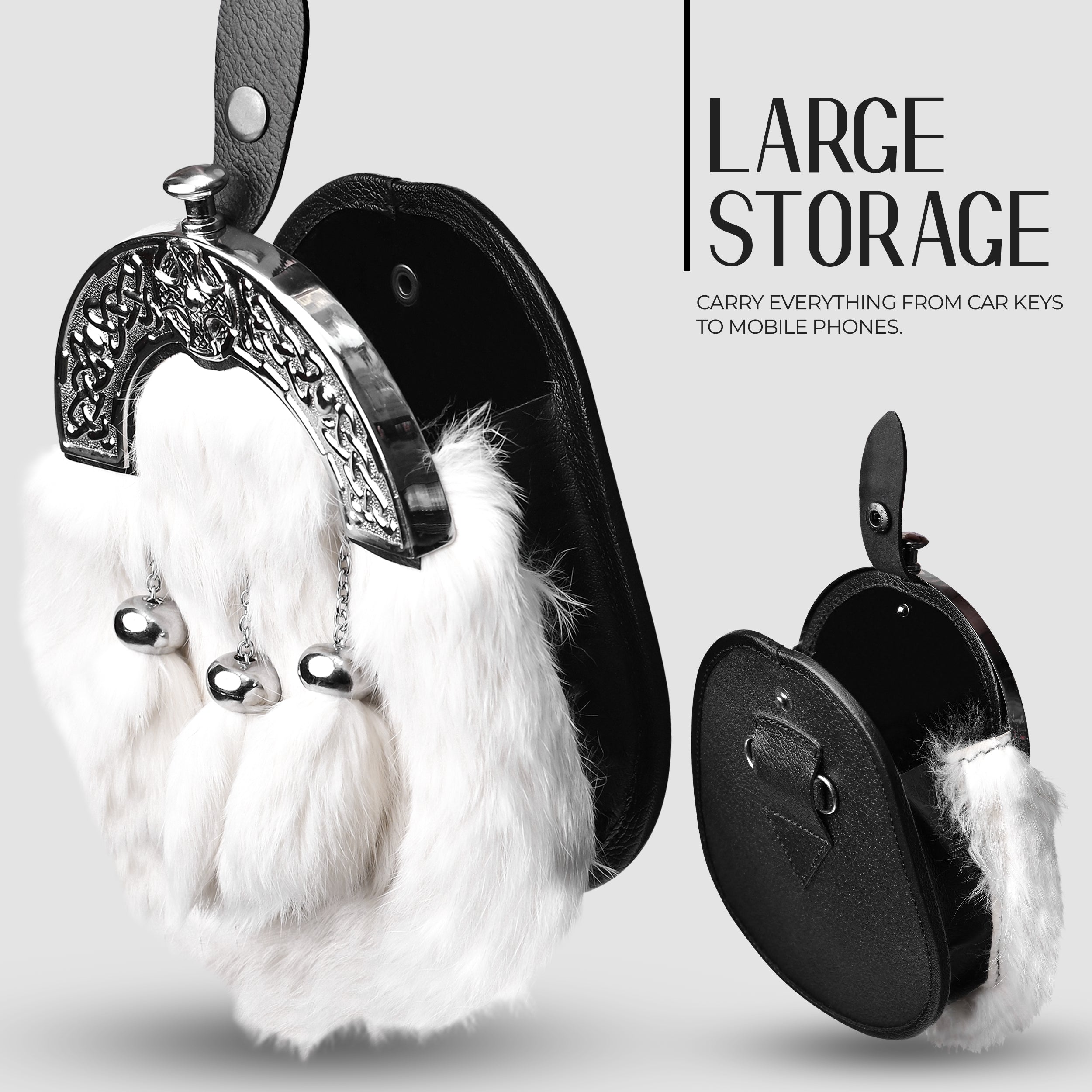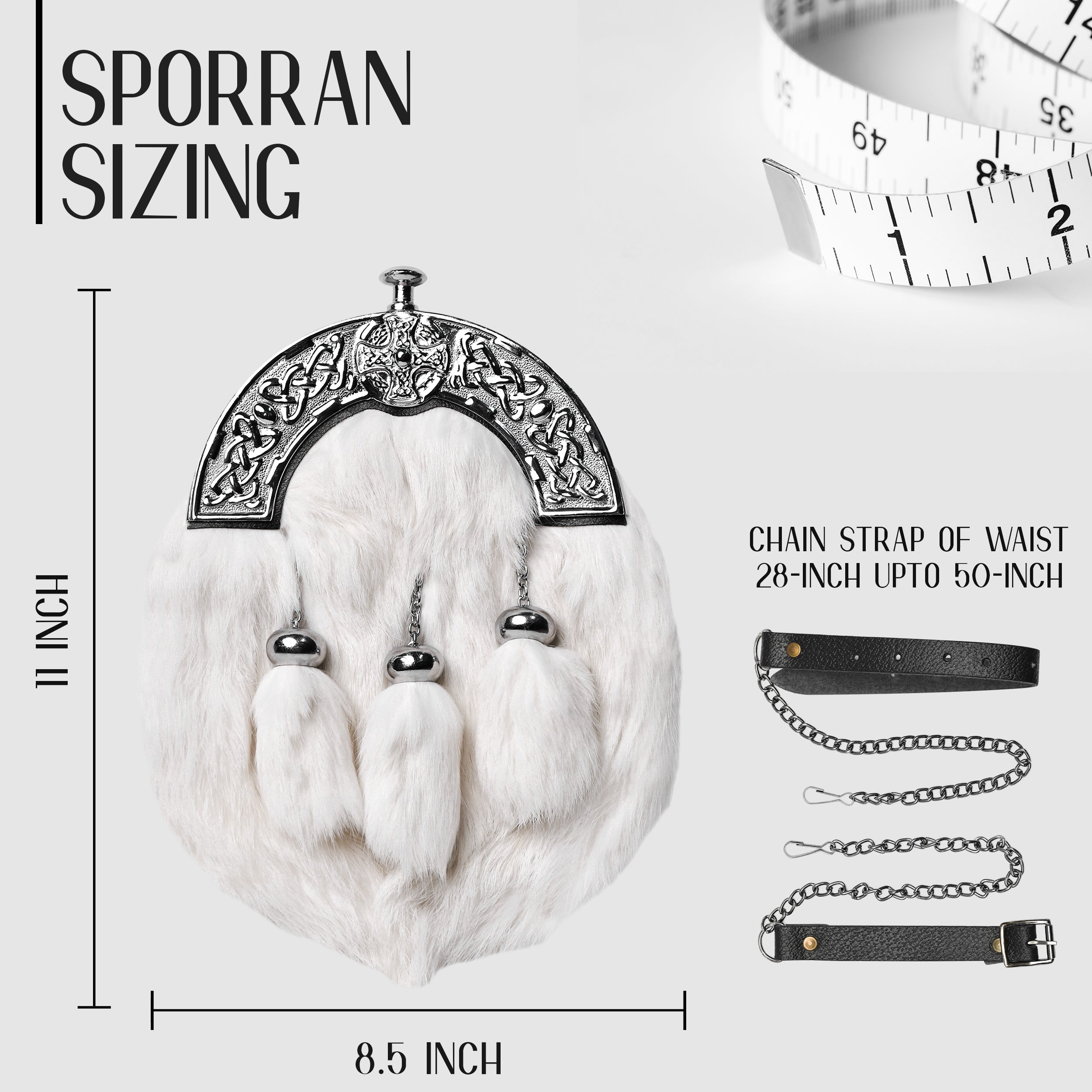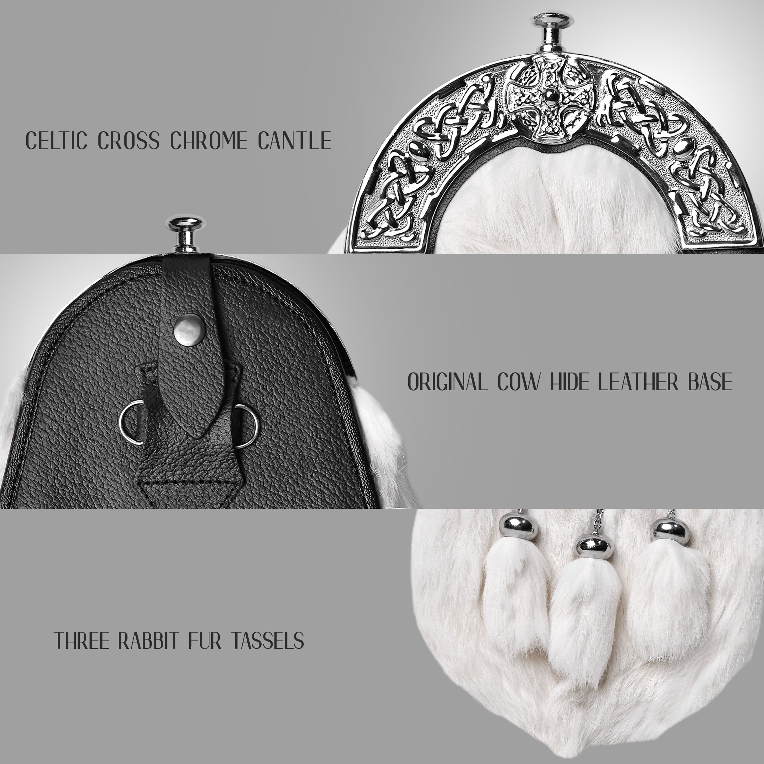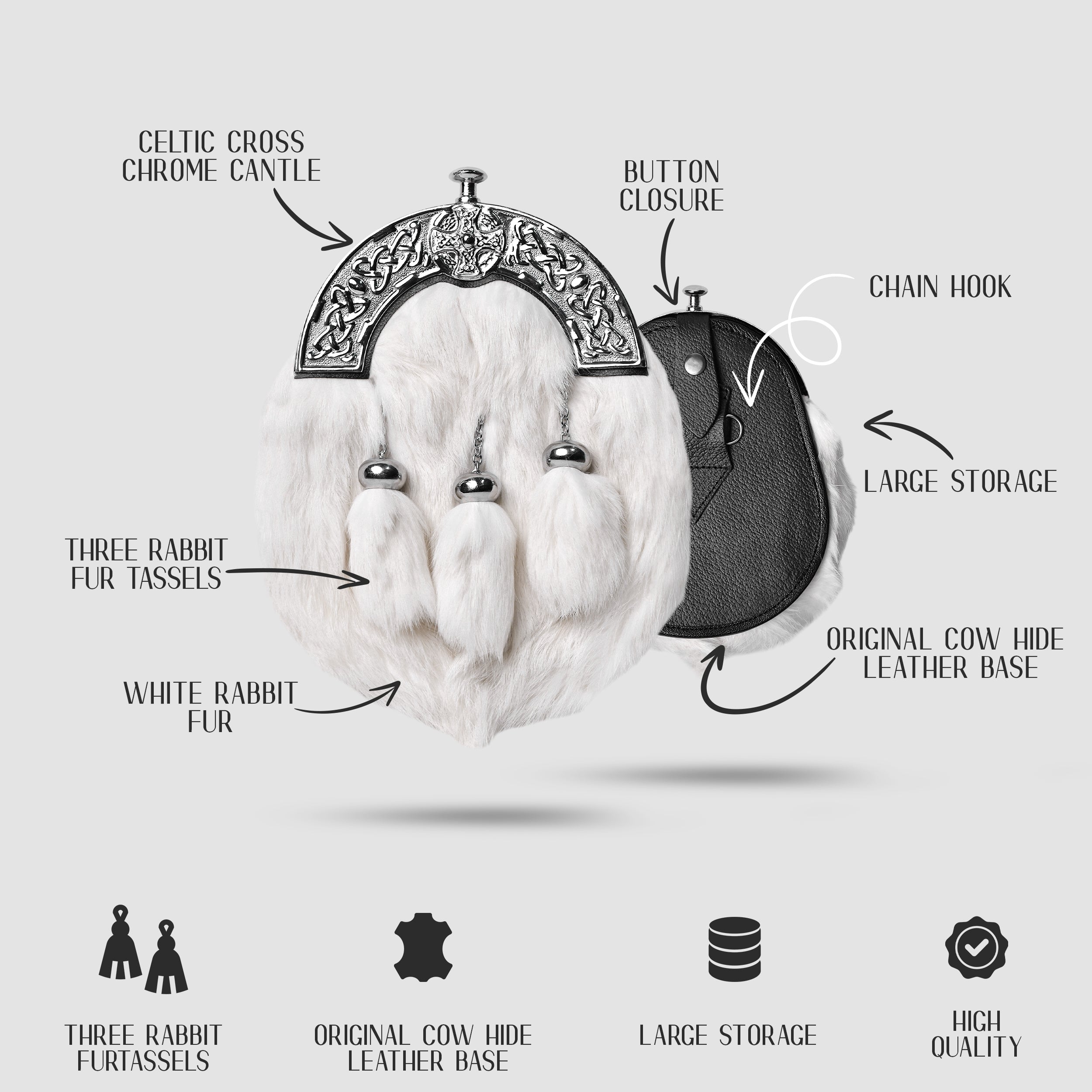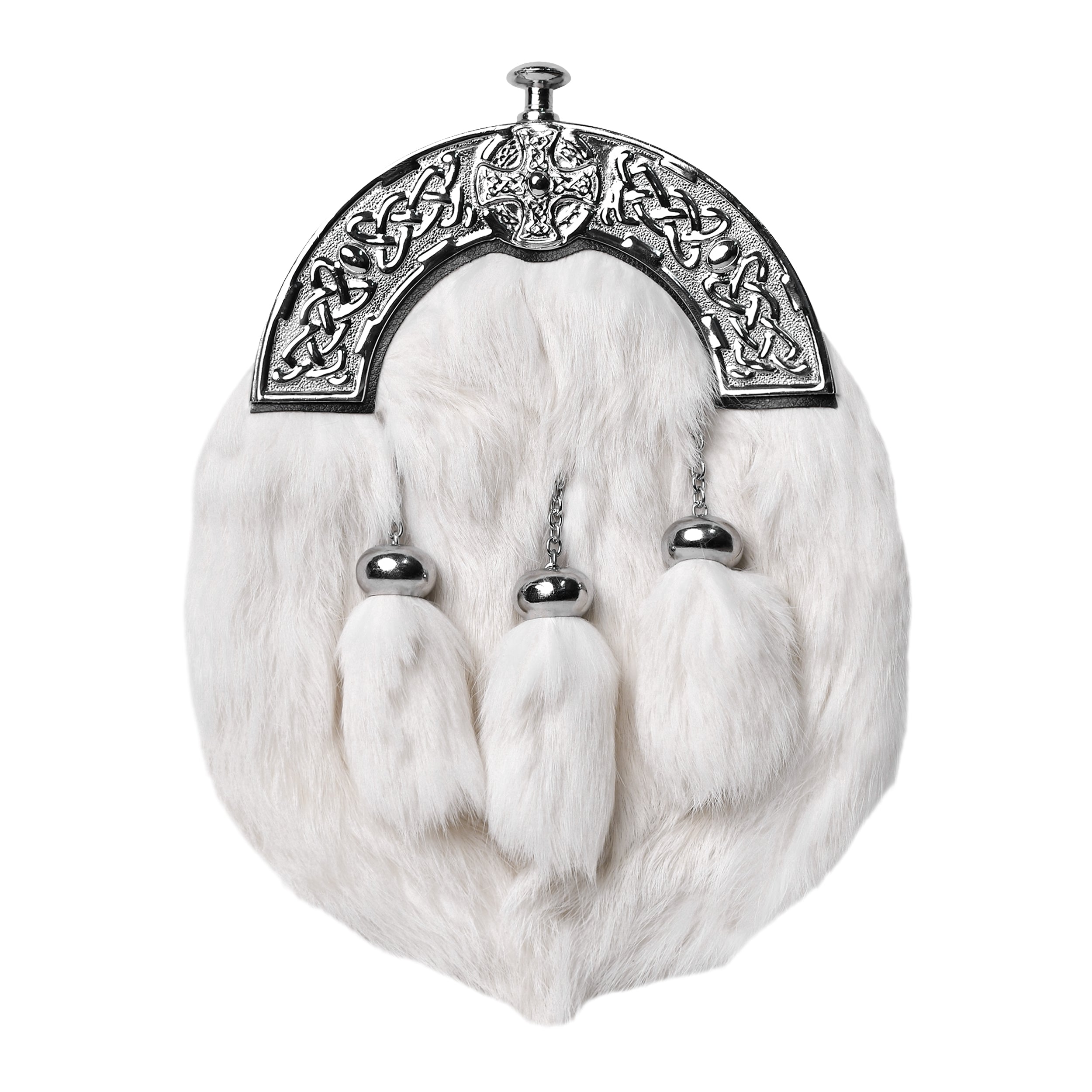 Add timeless elegance to your Highland outfit with this Formal White Rabbit Fur Sporran, designed to complement traditional kilts. Crafted from luxuriously soft white rabbit fur, it delivers a refined appearance with lasting durability. The cross chrome-finish cantle adds a classic full dress touch, making it ideal for formal wear.
