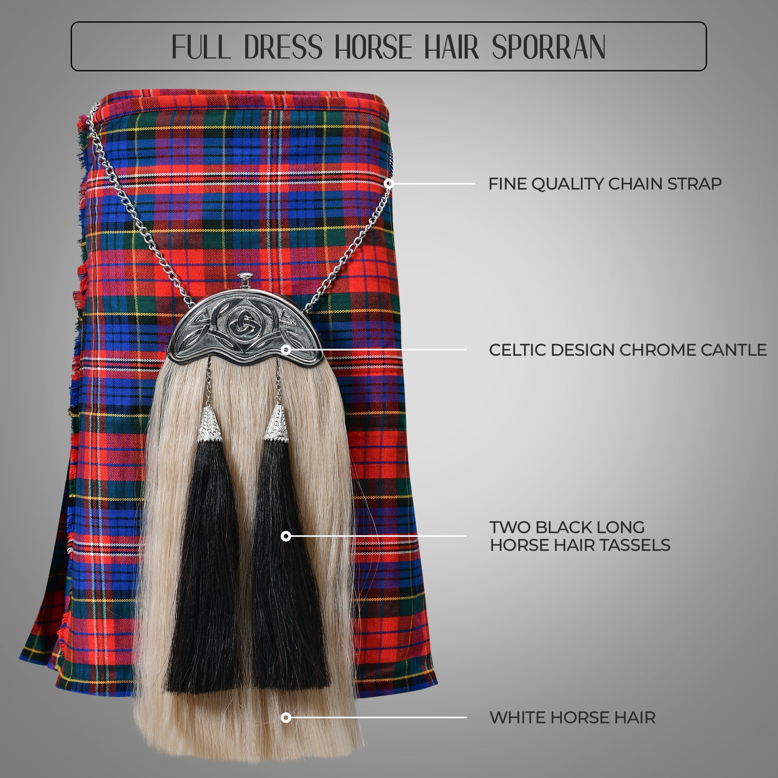 This horse hair sporran is really nice looking and decent quality (yes it's leather and real horse hair used). My husband recently bought a quality kilt with his ancestral tartan colors and really needed a better quality sporran to match the quality of the kilt- this one looks perfect with it. He's also a pretty big and tall guy, so the longer length also helps balance his height so the sporran doesn't look super tiny on him. The only issue he's had in the past is the chain holding the sporran breaking (he tends to carry a lot of things) so time will tell how well this chain holds up but it seems sturdy enough for now. Very happy with it!