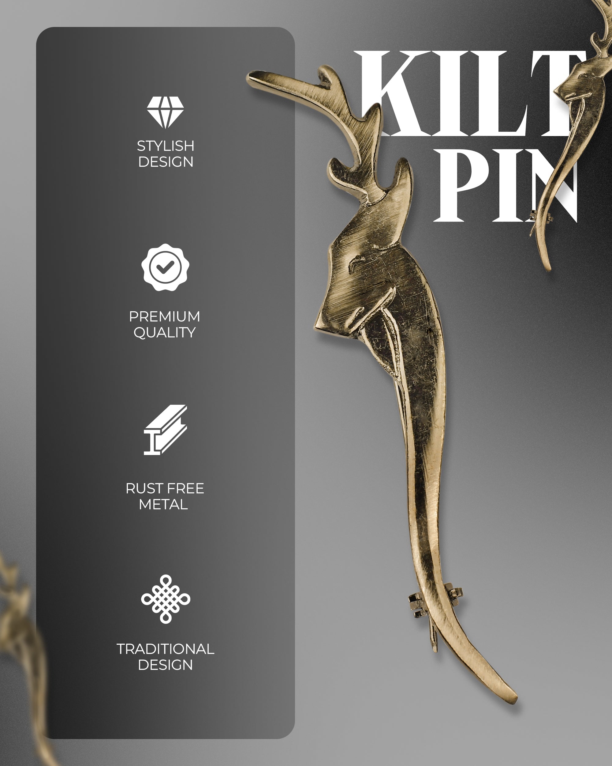 Elevate your traditional Scottish attire with our distinguished Stag Head Pewter Antique Kilt Pin. This authentic accessory not only secures your kilt with confidence but also showcases your appreciation for Celtic heritage. Crafted with meticulous attention to detail, the majestic stag design symbolizes nobility and strength, making it the perfect finishing touch for any formal or casual Highland ensemble.