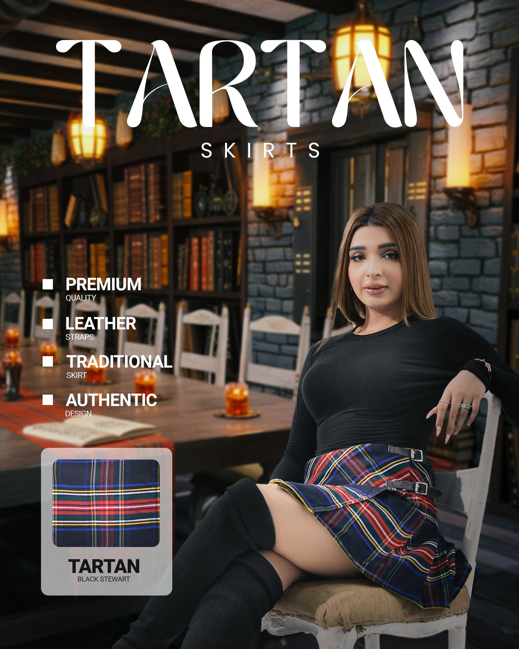 Introducing the Highland Women's Tartan Billie Skirt, a perfect fusion of traditional Scottish charm and modern style. Crafted from high-quality Polyviscose (P.V.) fabric, this skirt offers the ideal balance of durability, comfort, and breathability, making it perfect for all-day wear. Featuring the classic Black Stewart Plaid Tartan pattern, this skirt adds a sophisticated touch to any occasion, effortlessly combining elegance and functionality.